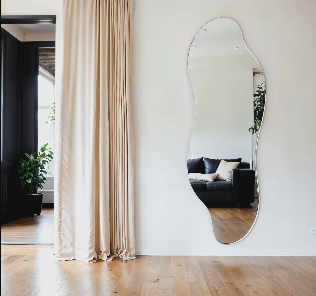 The Nova Irregular Mirror combines modern design with artistic flair, featuring a fluid, asymmetrical shape that adds uniqueness to any space. Its frameless construction highlights its minimalist charm, making it a perfect choice for contemporary interiors. With its ability to reflect natural light beautifully, it brightens rooms while serving as a functional and eye-catching décor piece.