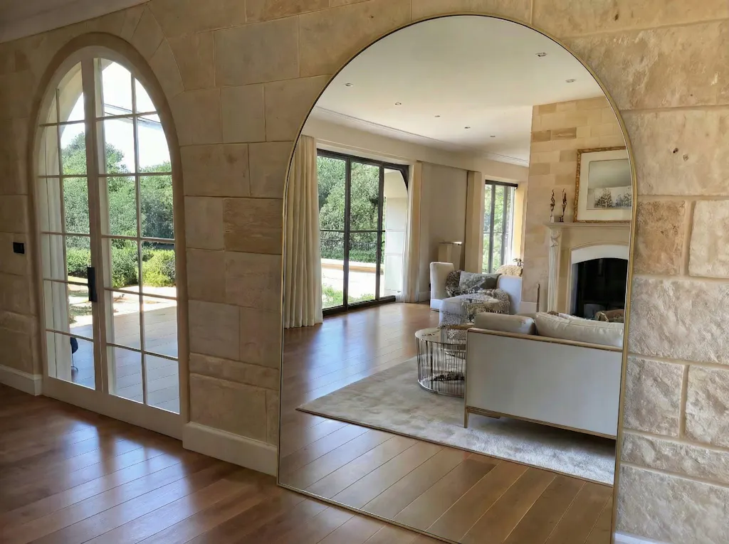 The Grand Arcadian Mirror combines timeless elegance with a modern architectural design, featuring a stunning brushed gold aluminum frame. Its graceful arched silhouette creates an exquisite statement piece that enhances the ambiance of any space. Perfect for grand living rooms, dining areas, hallways, or even boutique spaces, this mirror adds both depth and light, transforming your interiors into luxurious havens.
